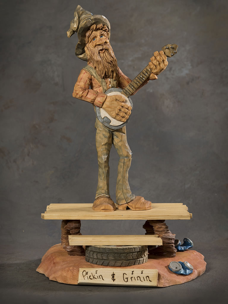 Dwayne Gosnell grew up in a small town in North Carolina. Like any other child dreaming of the day he would go off into the world and make his mark. In his childhood he would often help his father make wood projects like furniture and cedar chests. Woodworking gave him the ability to create something from nothing. It wasn’t until later in life, after serving in the marine corps he was thrown back into creating again. He happened into a local wood working shop and purchased a book on carving a face in walking sticks. After two trips to the emergency room, 3 dozen boxes of band-aids, and countless trips back to the carving store for more carving books, the man behind the counter said with a grin “you know we have a carving club right”. After the thought of “now you tell me” passed Dwayne got the information for the Catawba Valley Wood Carvers.