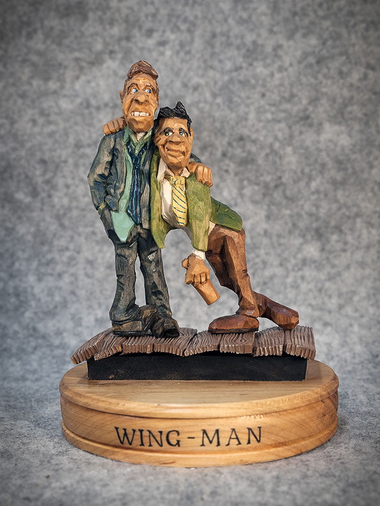 While leaving the the store, the old man said “bring some carvings with ya for show and tell”. The first night of the first club meeting Dwayne came into a crowded stock room, carrying his finest free plastic bag filled with two tools, carving books, and a dozen butchered faces carved into tree limbs. He sat alone in the back corner and thought “there’s no way I’m opening this bag of junk in front of these master carvers”. With the life sized birds and amazing caricatures they brought for show and tell Dwayne was overwhelmed. As he thought all this in his head, he heard a female voice say “Hi”. He looked around and saw Page Cartledge. Little did he know, that “Hi” would start a conversation which fueled the fire for caricature carving. After meeting Page and her husband Mitch, Mitch agreed to help Dwayne out and Dwayne carved with Mitch on Monday nights for almost a year.