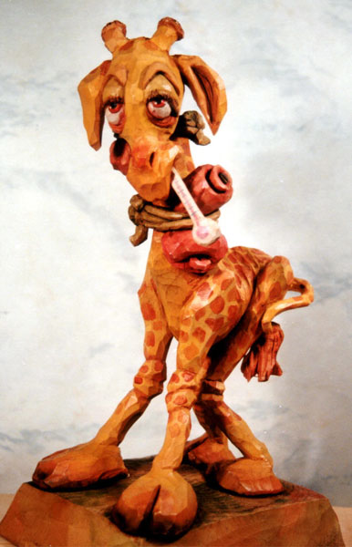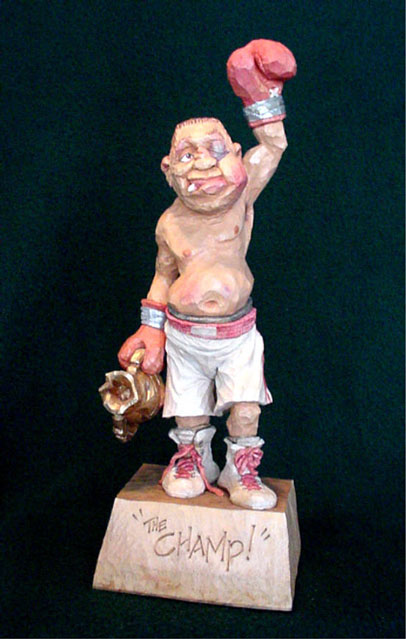 Peter’s work has been featured on local Television, several newspapers and national and international magazines. He won many awards and taught carving classes around the country. His biggest success was to win the Best of Show award and People’s Choice award at the 2000 International Woodcarvers Congress in Davenport, Iowa for his carving he called “Love”. Because a caricature had never done this before, it is considered a major breakthrough for caricature carving.